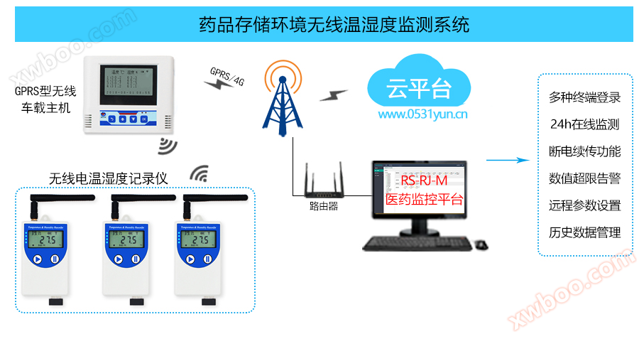 医院中所有的药品都存储在药房里,这些药品的质量直接关系到患者的身体健康。为此,医院药房采取了严格的药品养护存储措施,引用传感器+物联网技术建立了由无线电温湿度记录仪、GPRS型无线车载主机及监控软件组成的无线温湿度监测系统,对药房环境的温度和湿度进行中大面积、多点的集中监测,减少了人工巡查工作量及人工测量误差,实现无人值守的远程监控。